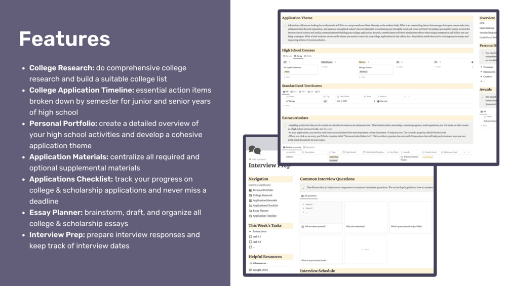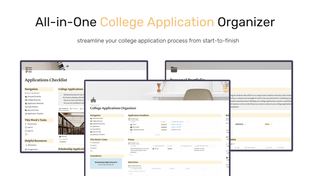 A comprehensive Notion template with pages to streamline your entire college application process, from building a college list to preparing and submitting application materials to keeping track of interviews.